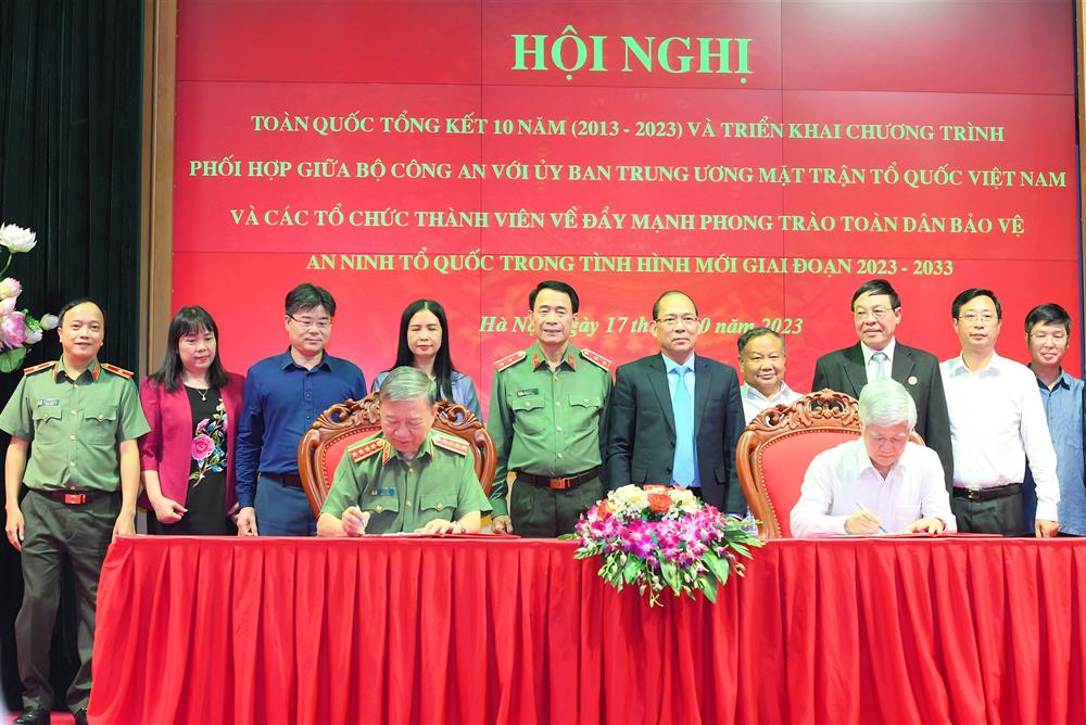 Bộ Công an và Ủy ban Trung ương Mặt trận Tổ quốc Việt Nam vừa tổng kết 10 năm (2013 – 2023) thực hiện Chương trình phối hợp số 09/CTr-BCA-MTTW và ký kết Chương trình phối hợp đẩy mạnh phong trào toàn dân bảo vệ an ninh Tổ quốc giai đoạn 2023 – 2033.