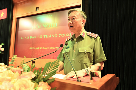 | Bộ trưởng Tô Lâm phát biểu chỉ đạo tại Hội nghị giao ban công tác công an tháng 7/2022 và triển khai nhiệm vụ công tác trọng tâm tháng 8/2022. |