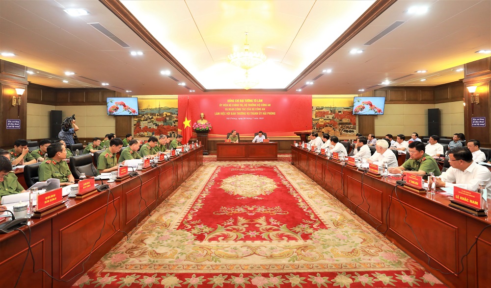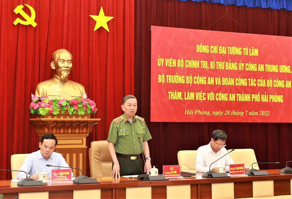 Tại buổi làm việc với Ban Thường vụ Thành ủy Hải Phòng về công tác phối hợp lãnh đạo, chỉ đạo bảo đảm an ninh, trật tự và xây dựng lực lượng Công an nhân dân gắn với phát triển kinh tế - xã hội trên địa bàn thành phố Hải Phòng, Bộ trưởng Tô Lâm nhấn mạnh Hải Phòng là đầu mối giao thông quan trọng của vùng kinh tế trọng điểm Bắc Bộ, là cửa chính ra biển của Thủ đô Hà Nội và các tỉnh phía Bắc. Bởi vậy, yêu cầu bảo đảm an ninh, trật tự trên địa bàn Hải Phòng là nhiệm vụ đặc biệt quan trọng, tuyệt đối không để xảy ra sai sót. Bộ trưởng Tô Lâm nhấn mạnh, Đảng ủy Công an Trung ương, Bộ Công an sẽ tiếp tục phối hợp chặt chẽ với Thành ủy Hải Phòng trong lãnh đạo, chỉ đạo bảo vệ vững chắc chủ quyền, an ninh biên giới quốc gia, bảo đảm trật tự, an toàn xã hội. Với vị thế của mình, Hải Phòng cần tiếp tục phát huy những kết quả đã đạt được trong thời gian qua; đồng thời giữ vững và tăng cường sự lãnh đạo trực tiếp, tuyệt đối về mọi mặt của cấp ủy đảng; sự quản lý tập trung, thống nhất của chính quyền các cấp đối với quốc phòng, an ninh và lực lượng vũ trang trên địa bàn thành phố. Xây dựng và phát huy mạnh mẽ “thế trận lòng dân” trong nền quốc phòng toàn dân và nền an ninh nhân dân; xây dựng và củng cố vững chắc thế trận quốc phòng toàn dân và thế trận an ninh nhân dân.