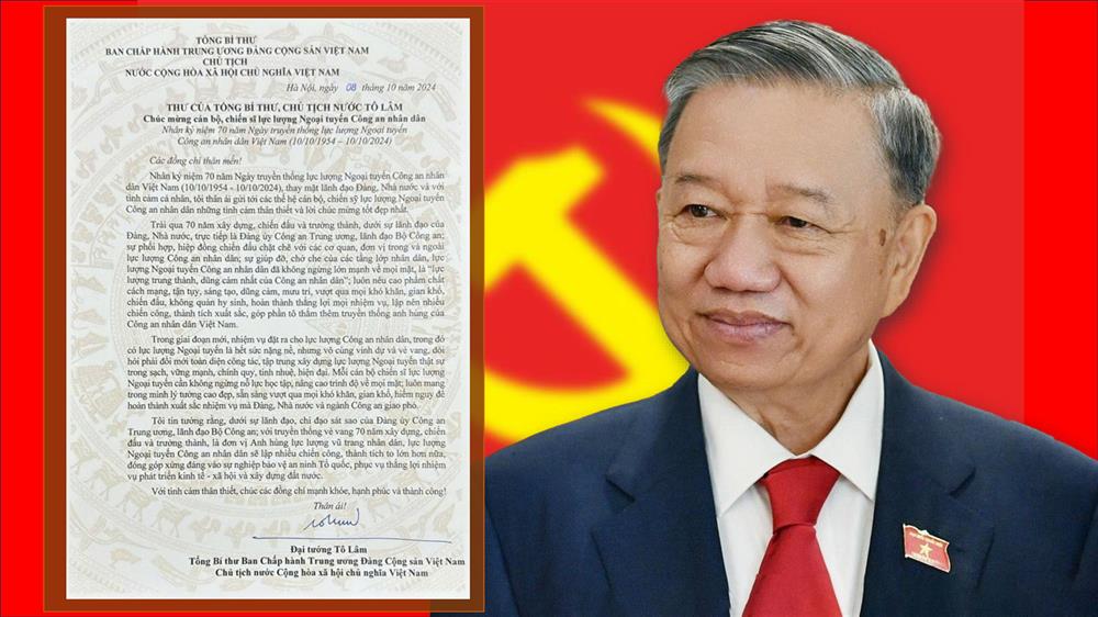 Nhân dịp này, Tổng Bí thư, Chủ tịch nước Tô Lâm đã gửi hoa và Thư chúc mừng CBCS lực lượng Ngoại tuyến Công an nhân dân (CAND) nhân kỷ niệm 70 năm Ngày truyền thống. Trong Thư, Tổng Bí thư, Chủ tịch nước Tô Lâm nêu rõ: Thay mặt lãnh đạo Đảng, Nhà nước và với tình cảm cá nhân, tôi thân ái gửi tới CBCS lực lượng Ngoại tuyến CAND những tình cảm thân thiết và lời chúc mừng tốt đẹp nhất.