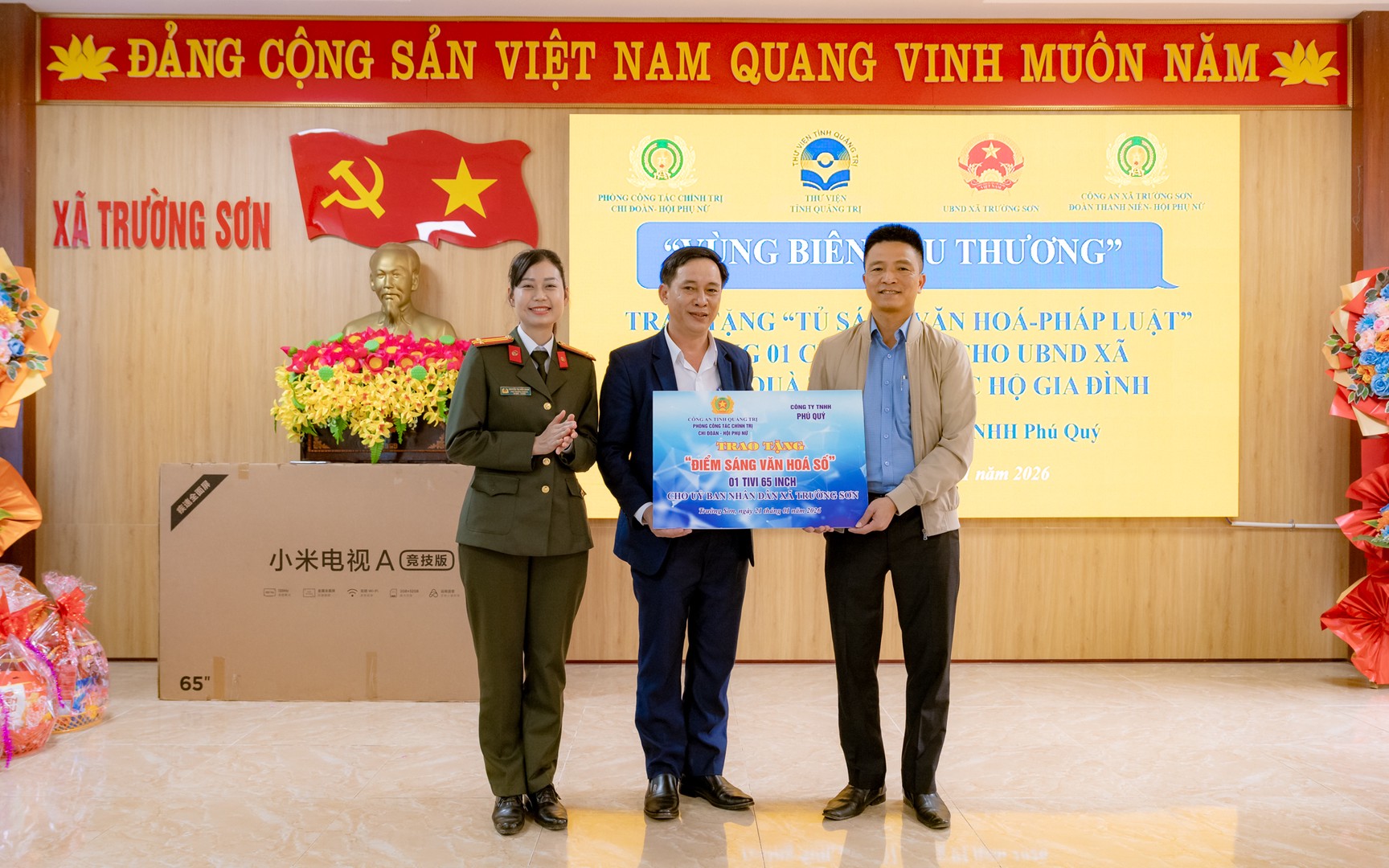 Rời điểm trường, hành trình sẻ chia tiếp tục nối dài đến Ủy ban nhân dân xã Trường Sơn. Tại đây, Đoàn đã trao tặng công trình “Điểm sáng văn hóa số” với chiếc tivi 65 inch hiện đại và “Tủ sách văn hóa – pháp luật” với hơn 200 đầu sách cho Nhà sinh hoạt cộng đồng xã, đặt nền móng cho việc xây dựng thói quen đọc sách và tìm hiểu pháp luật trong Nhân dân. Từ nay, bà con dân bản sẽ có thêm nơi để cập nhật tin tức, để tìm đọc những kiến thức hay về pháp luật, về kỹ thuật canh tác, từng bước đẩy lùi cái nghèo, cái lạc hậu.