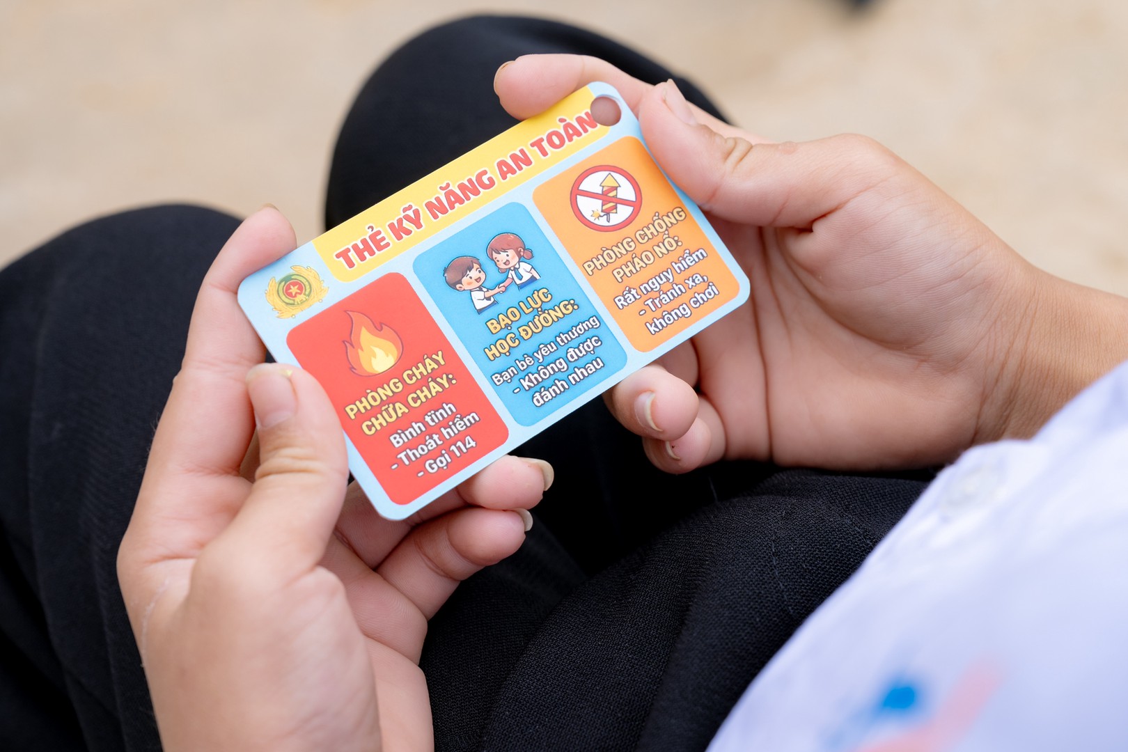 Tấm thẻ được thiết kế như một món đồ vật trang trí, như một người bạn đồng hành mỗi ngày đến lớp, nhắc nhở các em 3 điều cốt lõi: Phòng cháy chữa cháy (Bình tĩnh thoát hiểm, gọi 114); Phòng chống bạo lực học đường (Bạn bè yêu thương) và Phòng chống pháo nổ (Tuyệt đối tránh xa). Sáng kiến nhỏ này được xem là một phương pháp tiếp cận pháp luật mềm dẻo, giúp kiến thức tự nhiên đi vào nhận thức của các em một cách tự nhiên, gần gũi nhất.