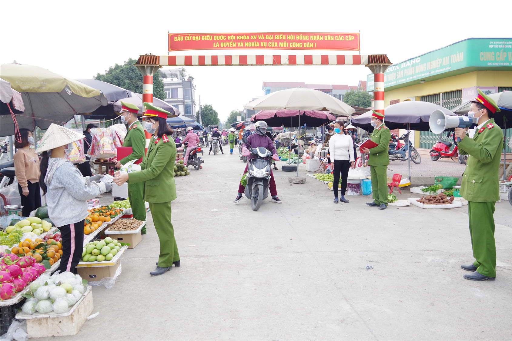 Lực lượng Công an xã Thi Sơn (huyện Kim Bảng, Hà Nam) tuyên truyền vận động nhân dân tích cực tham gia Bầu cử Quốc hội khóa XV; bầu cử Hội đồng nhân dân các cấp, nhiệm kỳ 2021 - 2026 và phòng, chống dịch COVID-19 trên địa bàn tháng 3/2021.