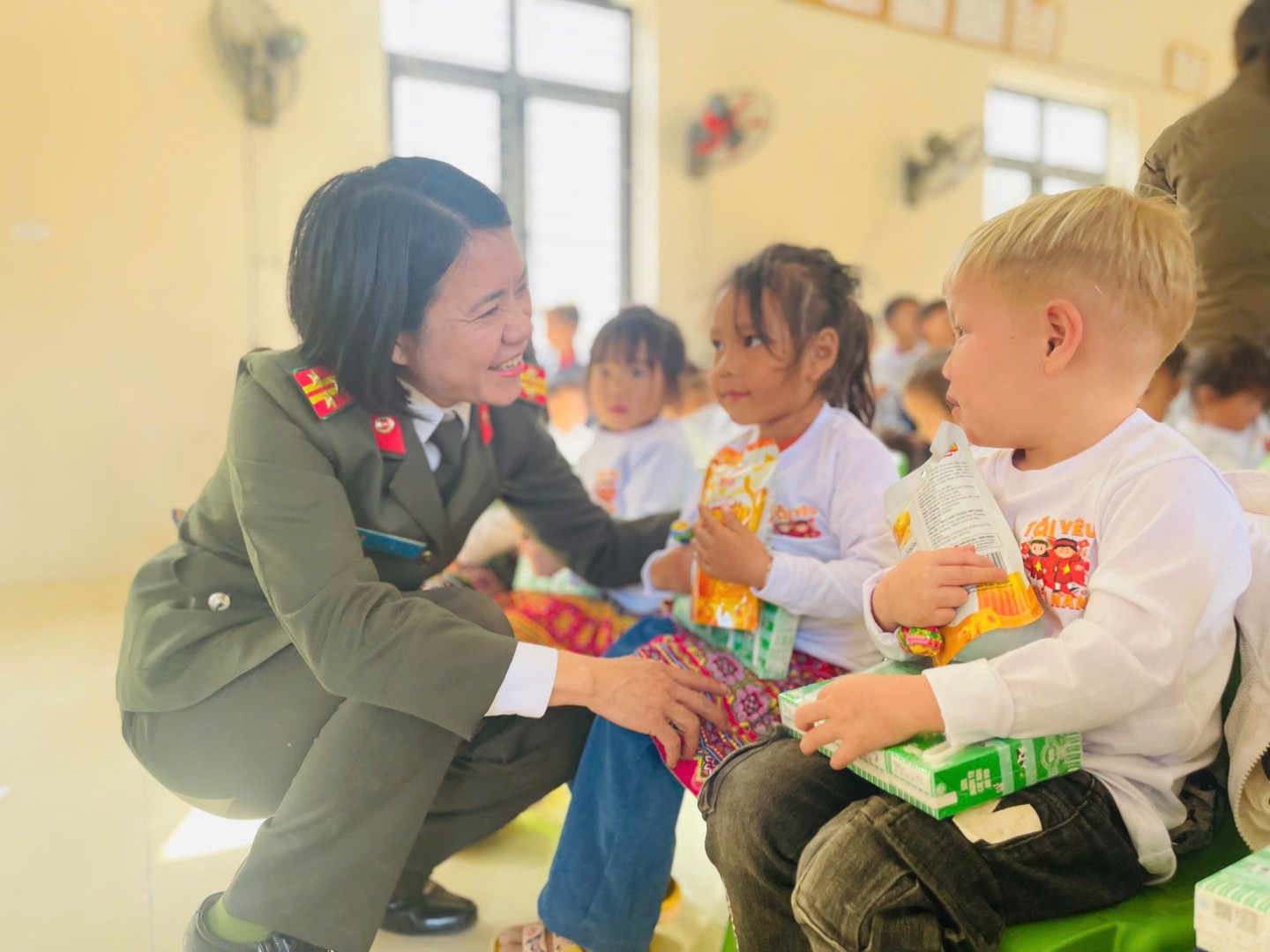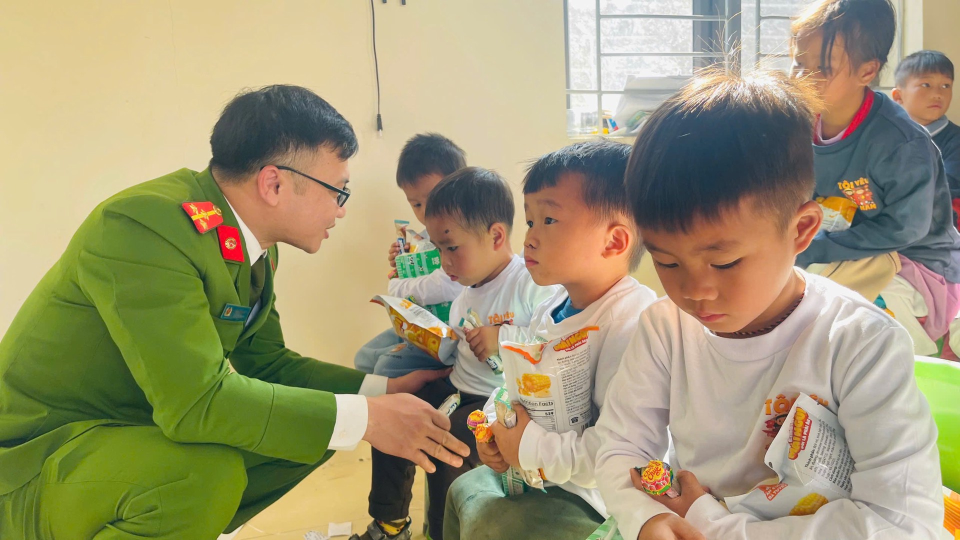 Tại điểm trường Trung Lý 2, Đoàn đã trao tận tay các em học sinh và người dân địa phương 550 bộ quần áo (bao gồm đồ trẻ em và người lớn), cùng nhiều nhu yếu phẩm thiết yếu như bánh kẹo và sữa. Mỗi chiếc áo mới, mỗi gói bánh không chỉ là sự hỗ trợ về vật chất mà còn là nguồn động viên tinh thần, giúp các em có thêm động lực để vững bước đến trường.