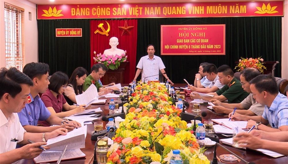 | Đồng chí Nguyễn Văn Ngọc, UVBCH Đảng bộ tỉnh, Bí thư Huyện ủy chủ trì Hội nghị Giao ban các cơ quan nội chính quán triệt thực hiện “Tăng cường bảo vệ nền tảng tư tưởng của Đảng, đấu tranh phản bác các quan điểm sai trái, thù địch trong tình hình mới” trên địa bàn huyện Đồng Hỷ. |